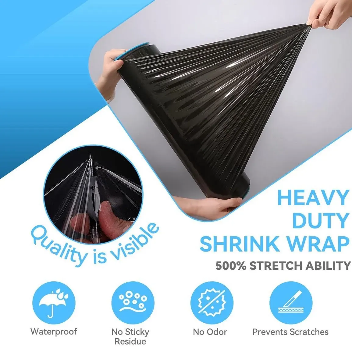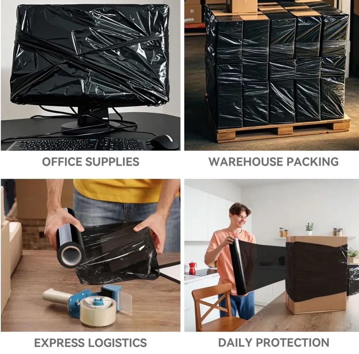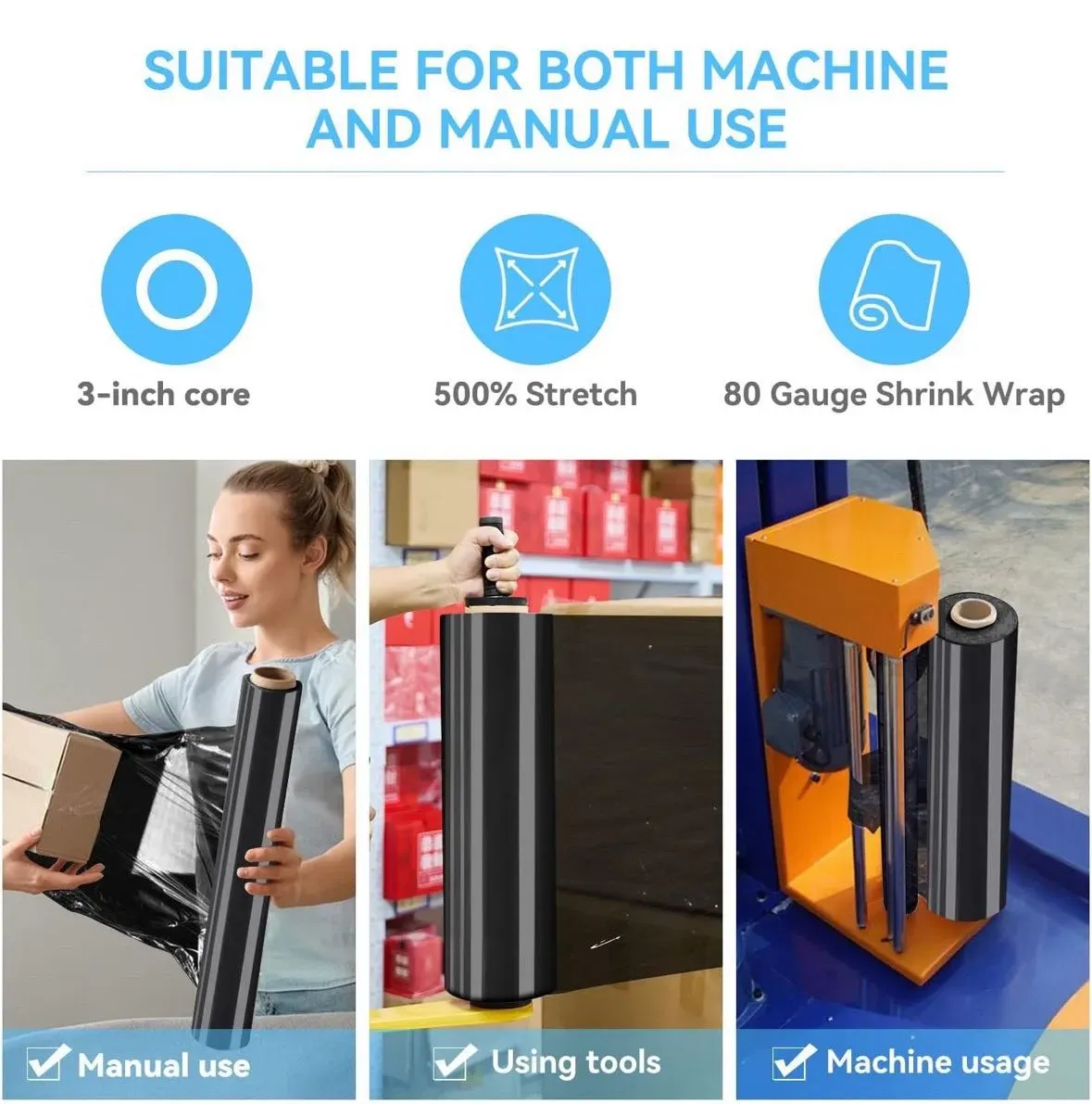 Rollo de envoltura elástica/retráctil de 18 x 1500 pies – Envoltura de plástico negro para mudanza, calibre 80 resistente, 600% elástico para embalaje, paletas, envío y protección