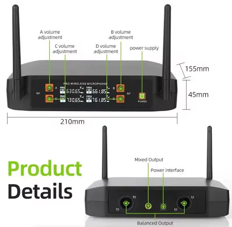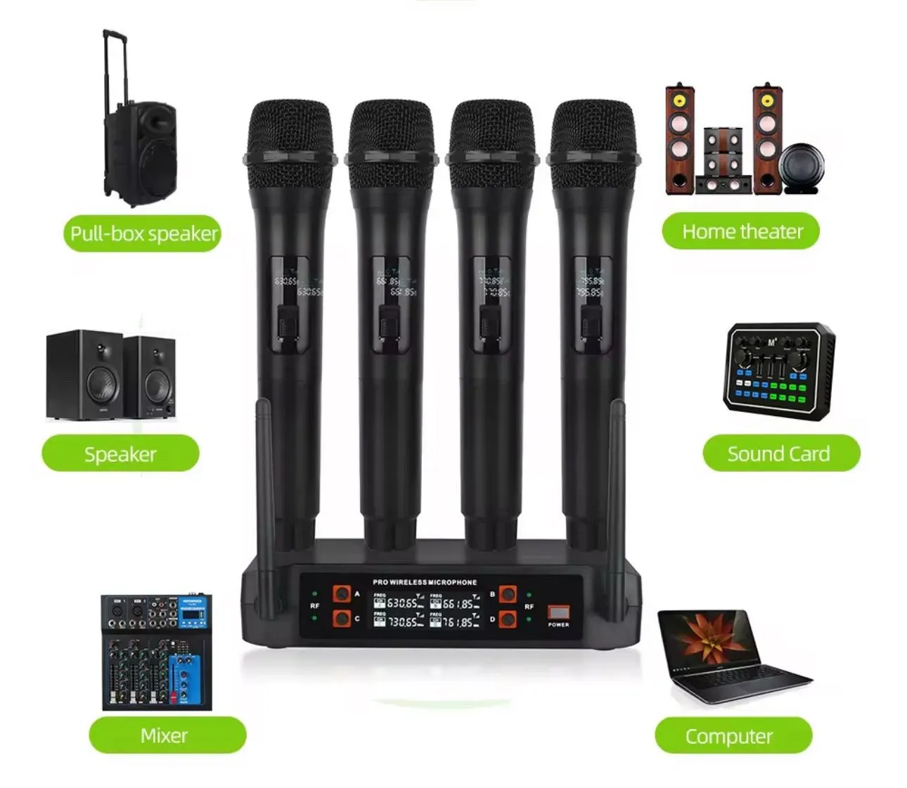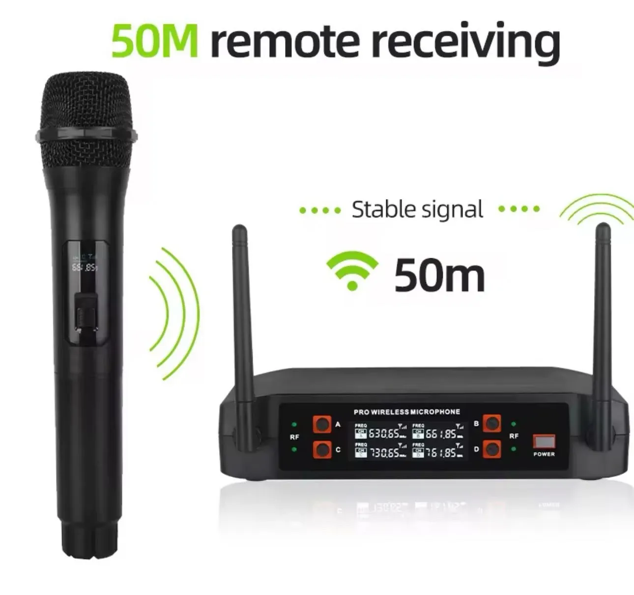 El Sistema de micrófono inalámbrico UHF profesional de 4 unidades marca Rayhayes está diseñado para quienes buscan calidad, potencia y estabilidad en presentaciones en vivo.
