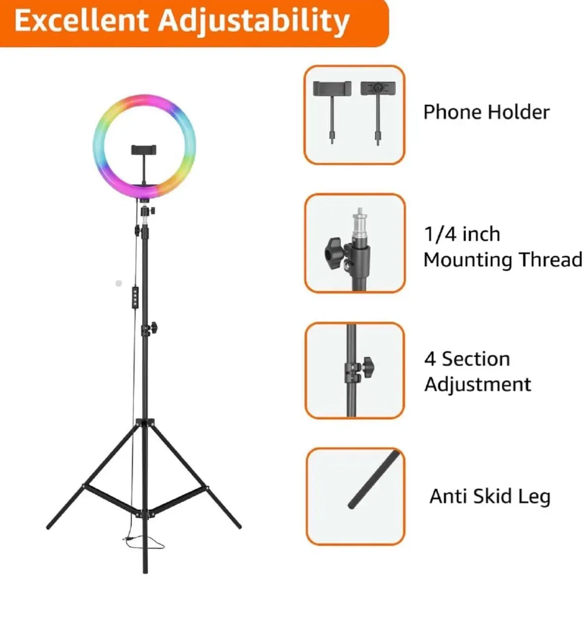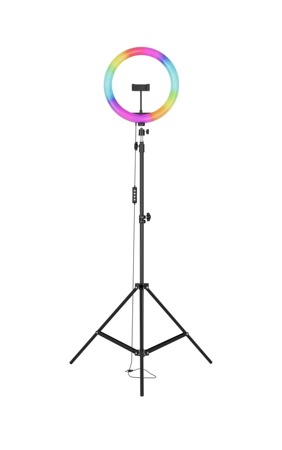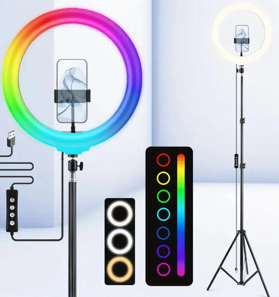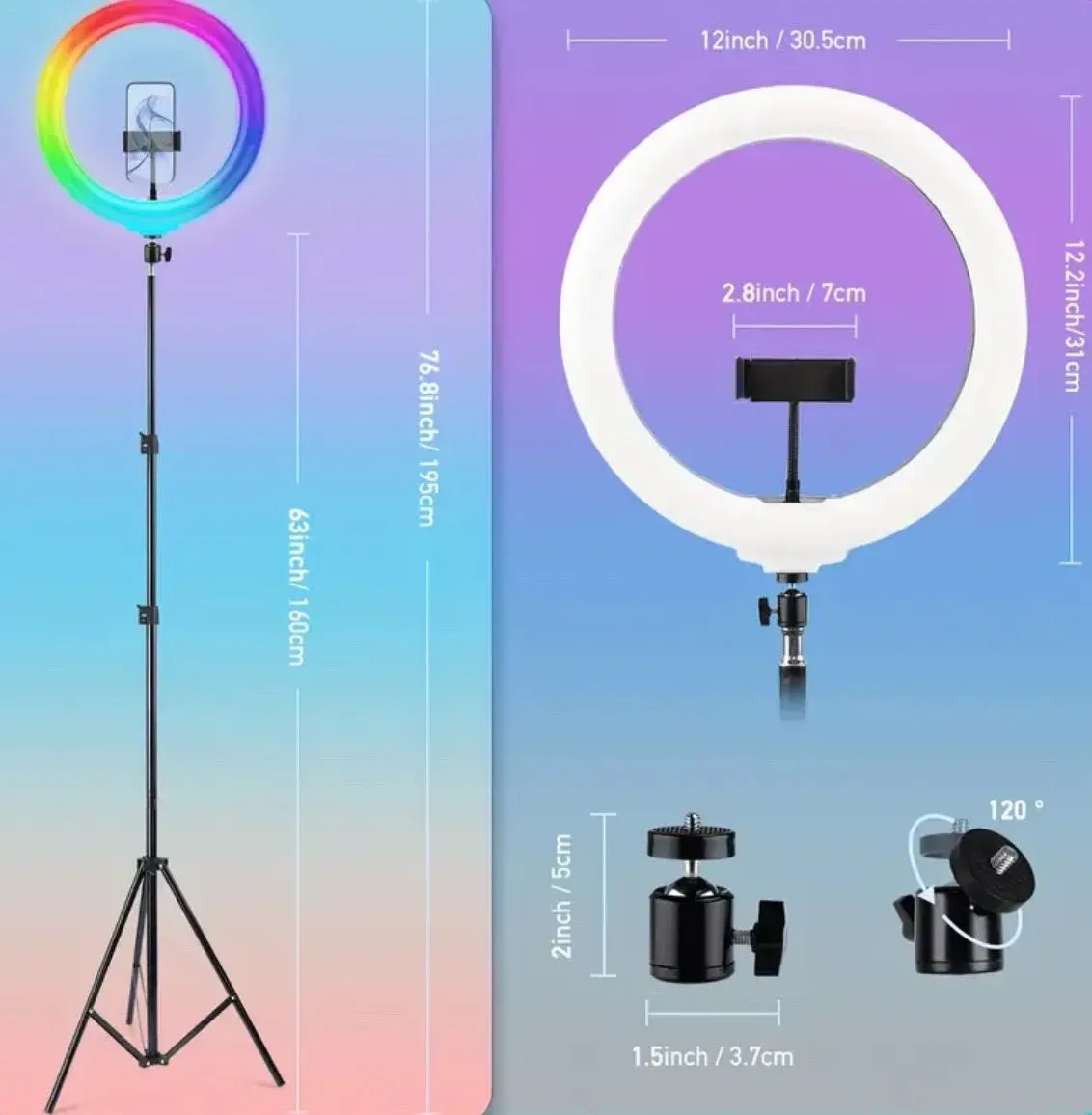 Luz de anillo RGB de 12 pulgadas, con alimentación USB, trípode desmontable de 2 piezas de 76 pulgadas de alto , múltiples modos de color, soporte para teléfono, control con botón ajustable de 180 grados, ideal para bailes de TikTok y transmisiones en vivo