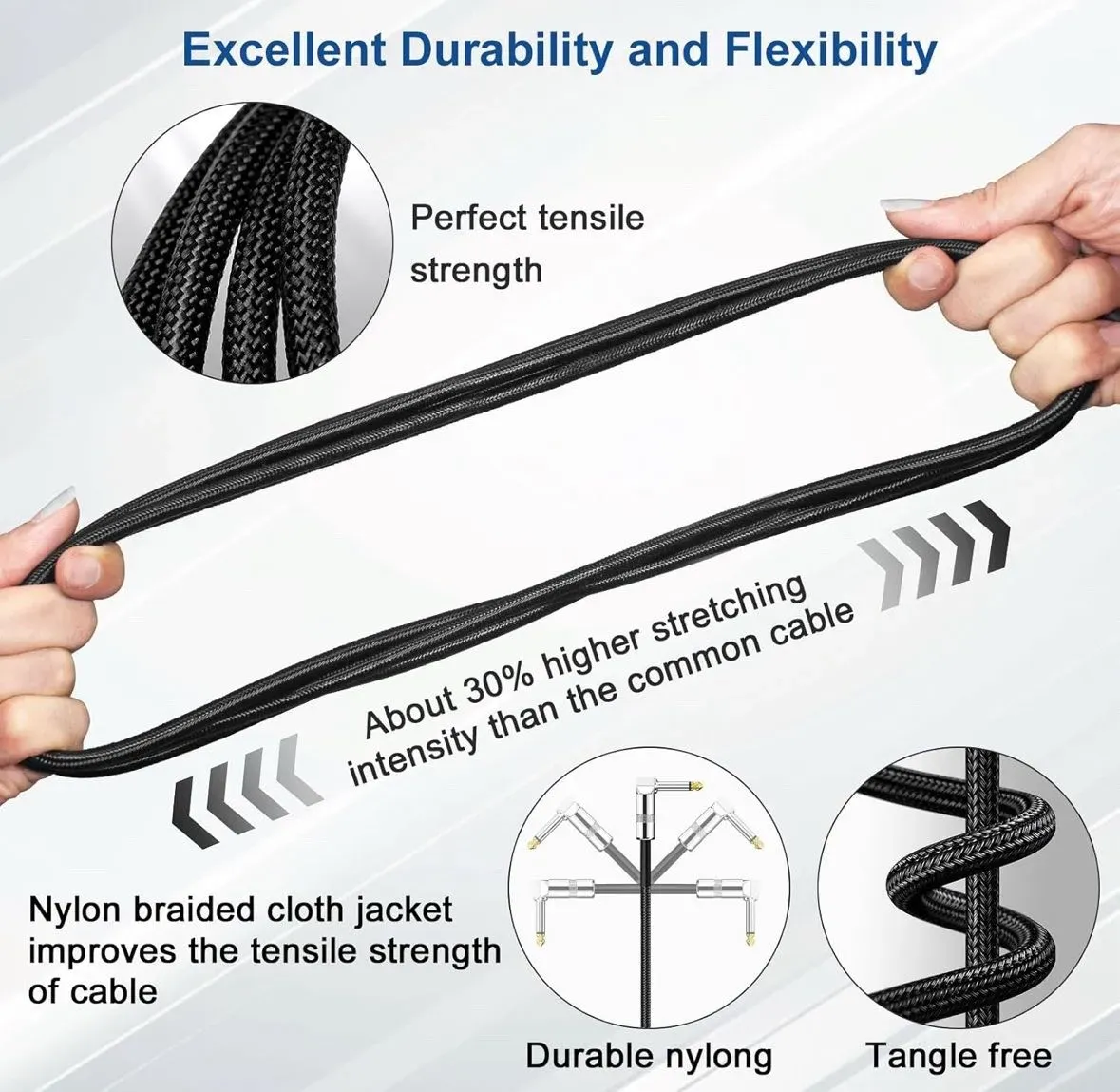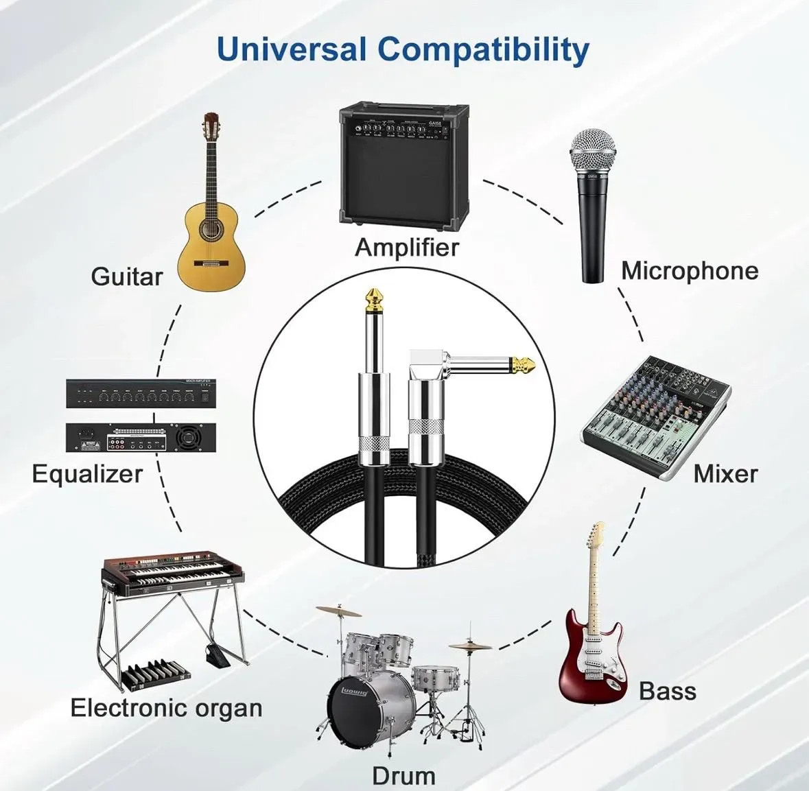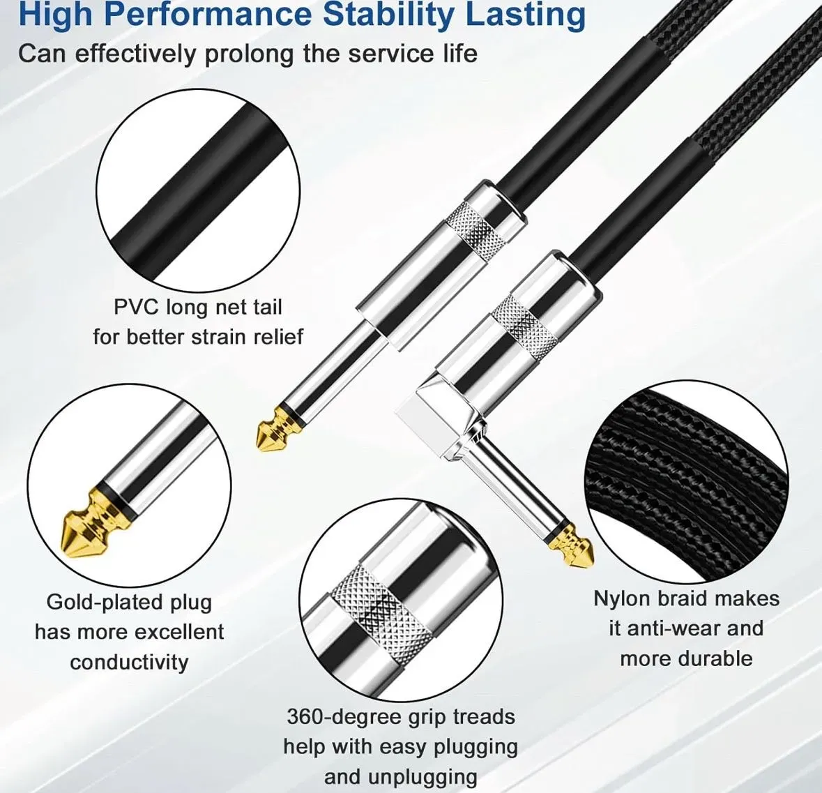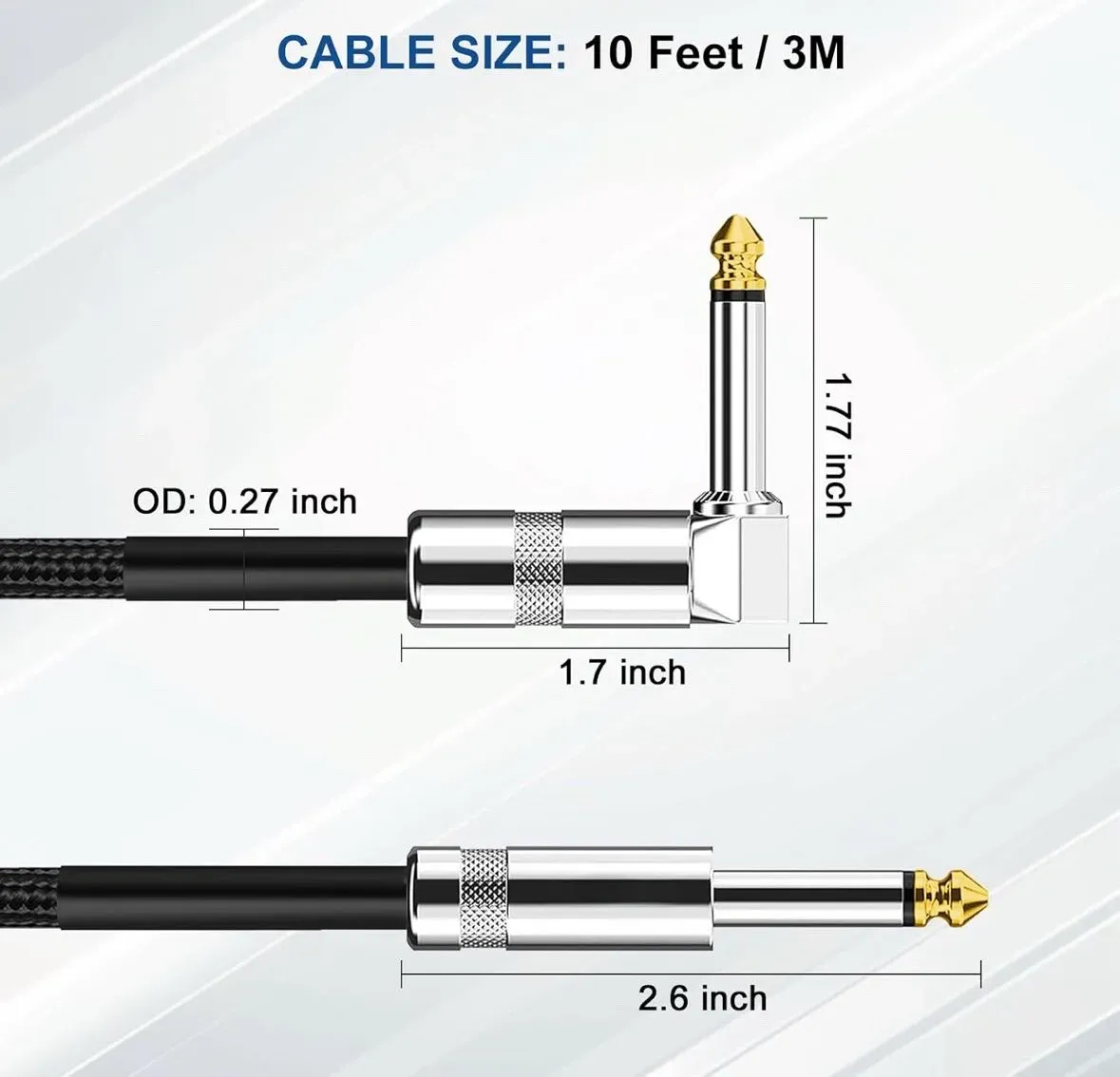 - Cable de instrumento: Conector macho a macho de 0.250 pulgadas (1/4") ideal para guitarras eléctricas, bajos y otros instrumentos.