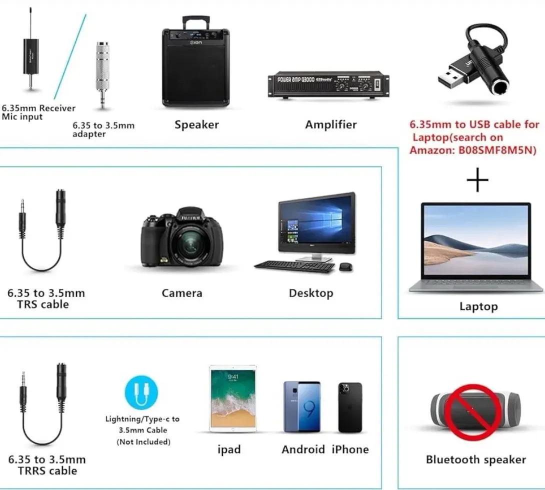 - Tres tipos de micrófonos: Incluye micrófono de mano, lavalier y auricular para adaptarse a diversas necesidades de grabación o presentación.